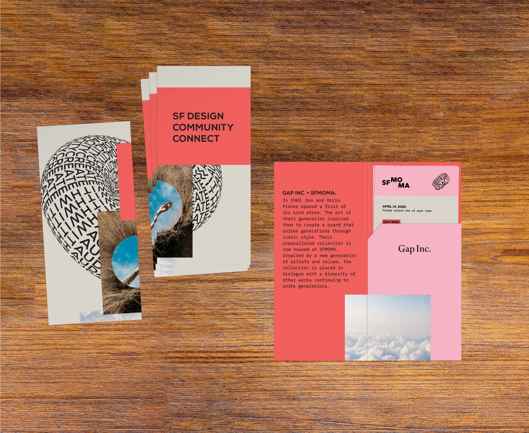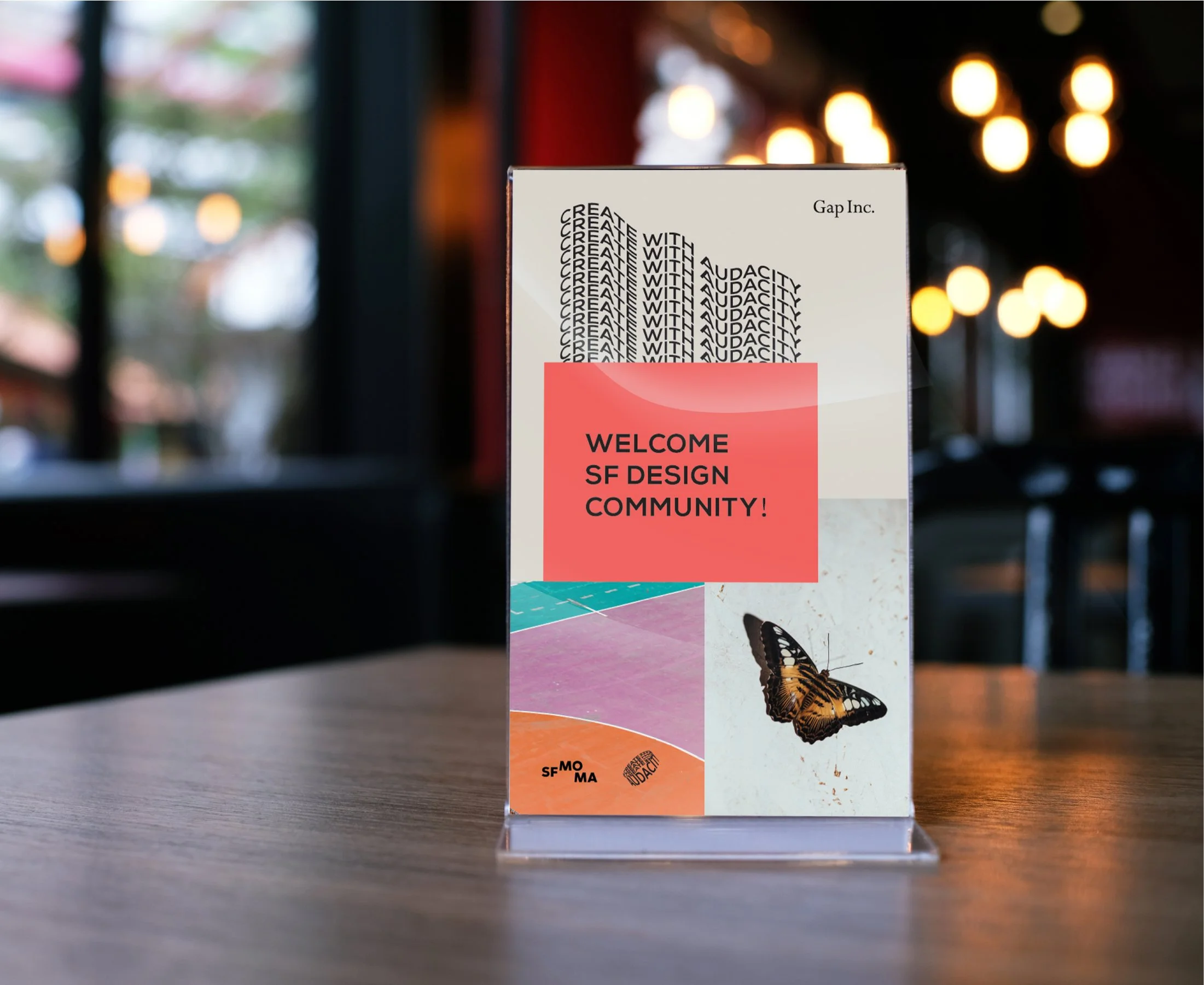 Gap Inc’s ‘Create With Audacity’ program hosted a design event at SFMOMA. I used the CWA toolkit to design an event poster, a brochure which held a dinner menu and exhibition info insert, a table tent, and a bar menu.